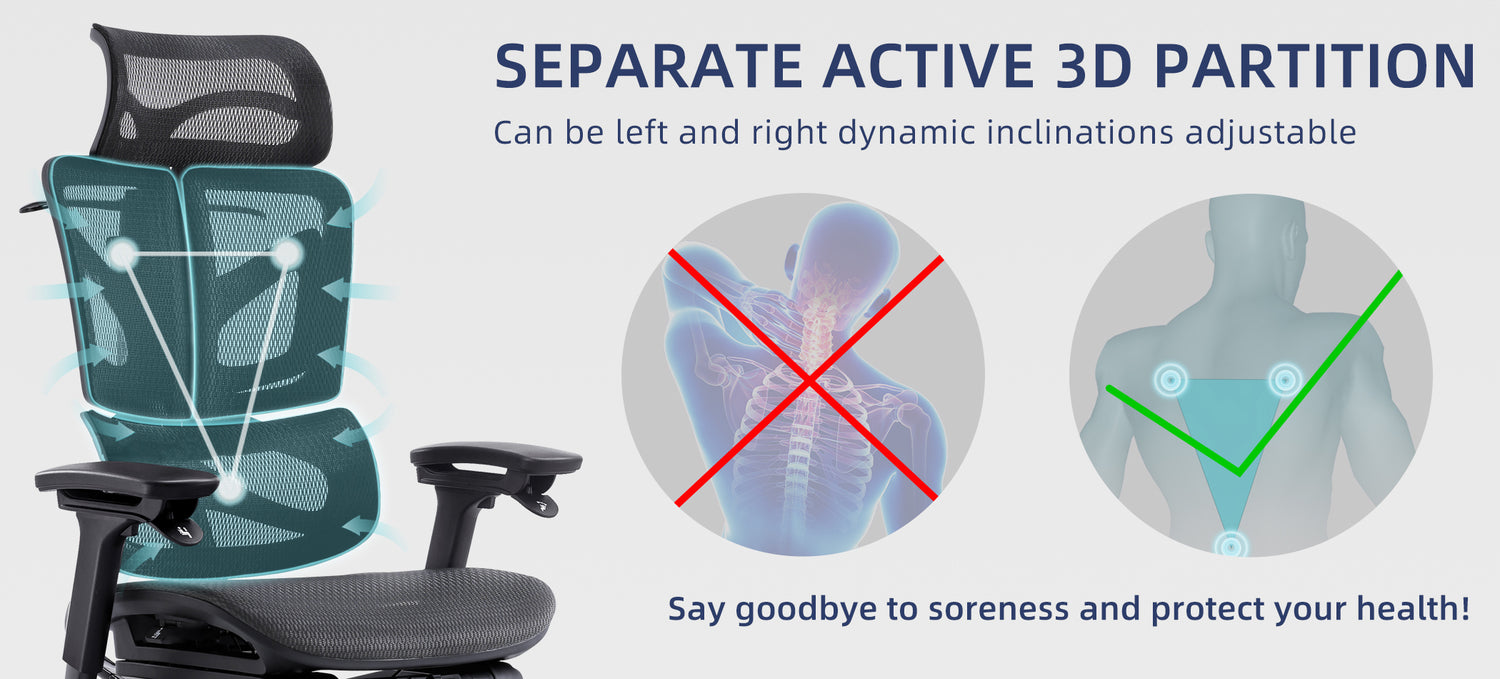Discover unparalleled comfort with the OdinLake Ergo BUTTERFLY 753 ergonomic chair. The 2D headrest, butterfly split backrest, flexible lumbar support, and optional footrest provide comprehensive support, ensuring a relaxed and stress-free seating experience in daily use.